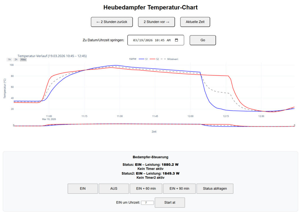 Ich habe zu meinem persoenlichen Vergnuegen noch ein Webinterface gebaut, auf dem ich ebenfalls auf dieser Datenbasis, also aus dieser Datenbank einen netten Graphen gebaut habe, so dass man den Temperaturverlauf auch schoen beobachten kann. Zudem kann man die Boxen damit auch remote ein-/ausschalten oder fuer einen bestimmte Zeitspanne Einschalten oder nach einer bestimmten Zeitspanne einschalten. Das bietet alles die Shelly Steckdose selbst. Man muss es nur ansteuern.